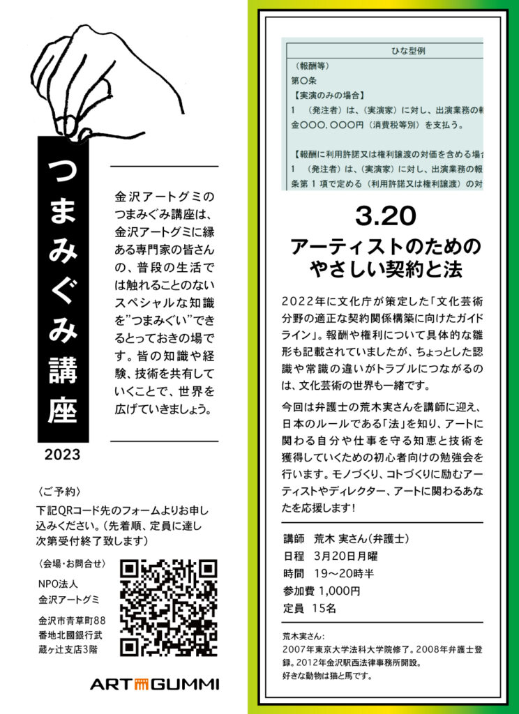 今回は弁護士の荒木実さんを講師に迎え、日本のルールである「法」を知り、アートに関わる自分や仕事を守る知恵と技術を獲得していくための初心者向けの勉強会を行います。モノづくり、コトづくりに励むアーティストやディレクター、アートに関わるあなたを応援します!