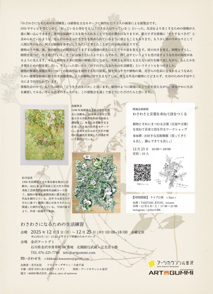情報社会の中で、私たちは時に「どう生きたものか」と迷います。植物のように環境に応じて形を変えながら、ゆるやかに生活を練習してみる。そんな思考のきっかけを、この展覧会を通して感じていただけたらと思います。