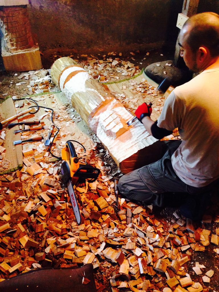 現代彫刻家・長谷川琢士が、チェーンソー・鑿(のみ)を用いて約 2m の能登ヒバから仏像を掘り出します。生木の状態から徐々に浮かび上がってくる清々たる伊須流岐比古神像の姿を、迫力あるライブ彫刻とともにぜひお楽しみ下さい。完成時には、ご住職による墨の入魂も行います。