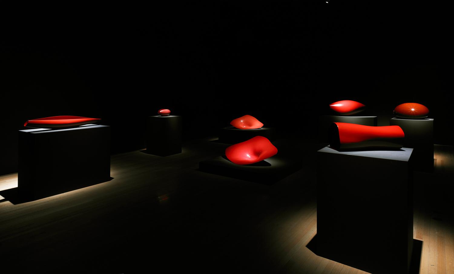 田中信行は表現素材として「漆」を選択し、今日まで漆による新たな造形の世界を切り開いてきました。麻布を漆で貼り重ねる乾漆技法を用いて形作るものは、碗や膳等、日常の器物ではなく、漆の皮膜そのものが表現の主役となる自立した立体造形です。その形は天然の樹液である漆に喚起され導き出されており、普遍的な魅力を持つ独自の表現として国内外で高く評価されています。