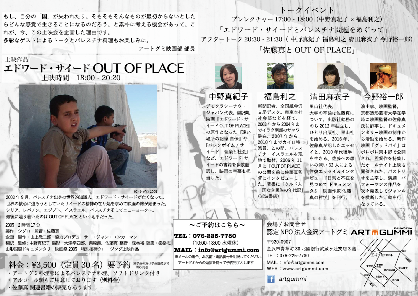 今回のプログラムは佐藤真監督作品「エドワード・サイード OUT OF PLACE」上映&中野真紀子×福島利之×清田麻衣子×今野裕一郎トーク。